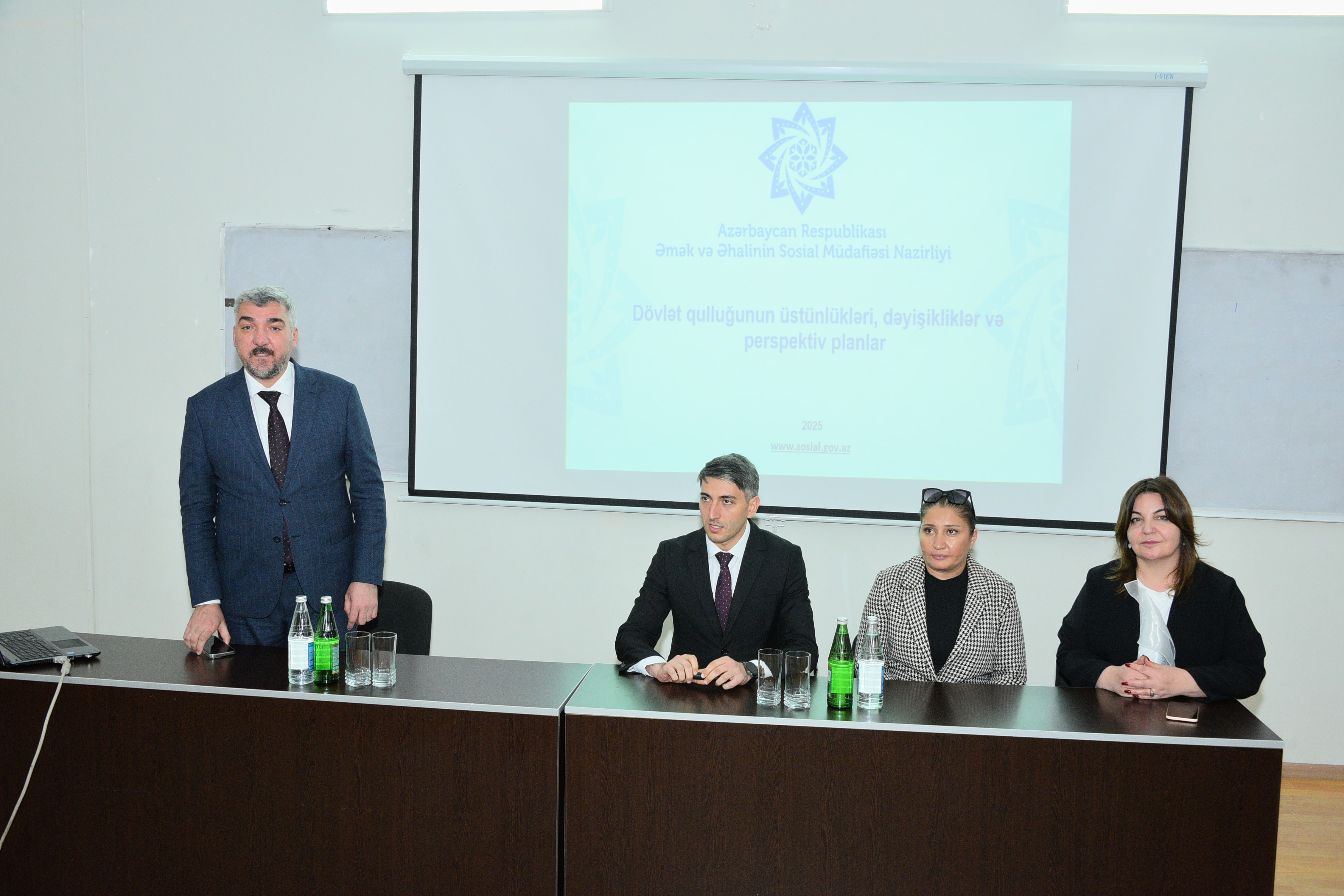 Noyabrın 14-də Sumqayıt Dövlət Universitetində Azərbaycan Respublikasının Əmək və Əhalinin Sosial Müdafiəsi Nazirliyinin (ƏƏSMN) əməkdaşlarının iştirakı ilə “Dövlət qulluğun... Davamı