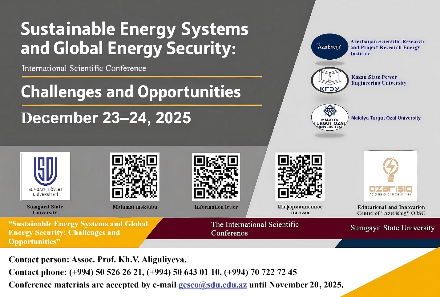 23-24 Dekabr 2025-ci il tarixlərində Sumqayıt Dövlət Universiteti, Kazan Dövlət Energetika Universiteti, Malatya Turgut Özal Universiteti, Azərbaycan Elmi-Tədqiqat və Layihə-Axtar... Davamı
