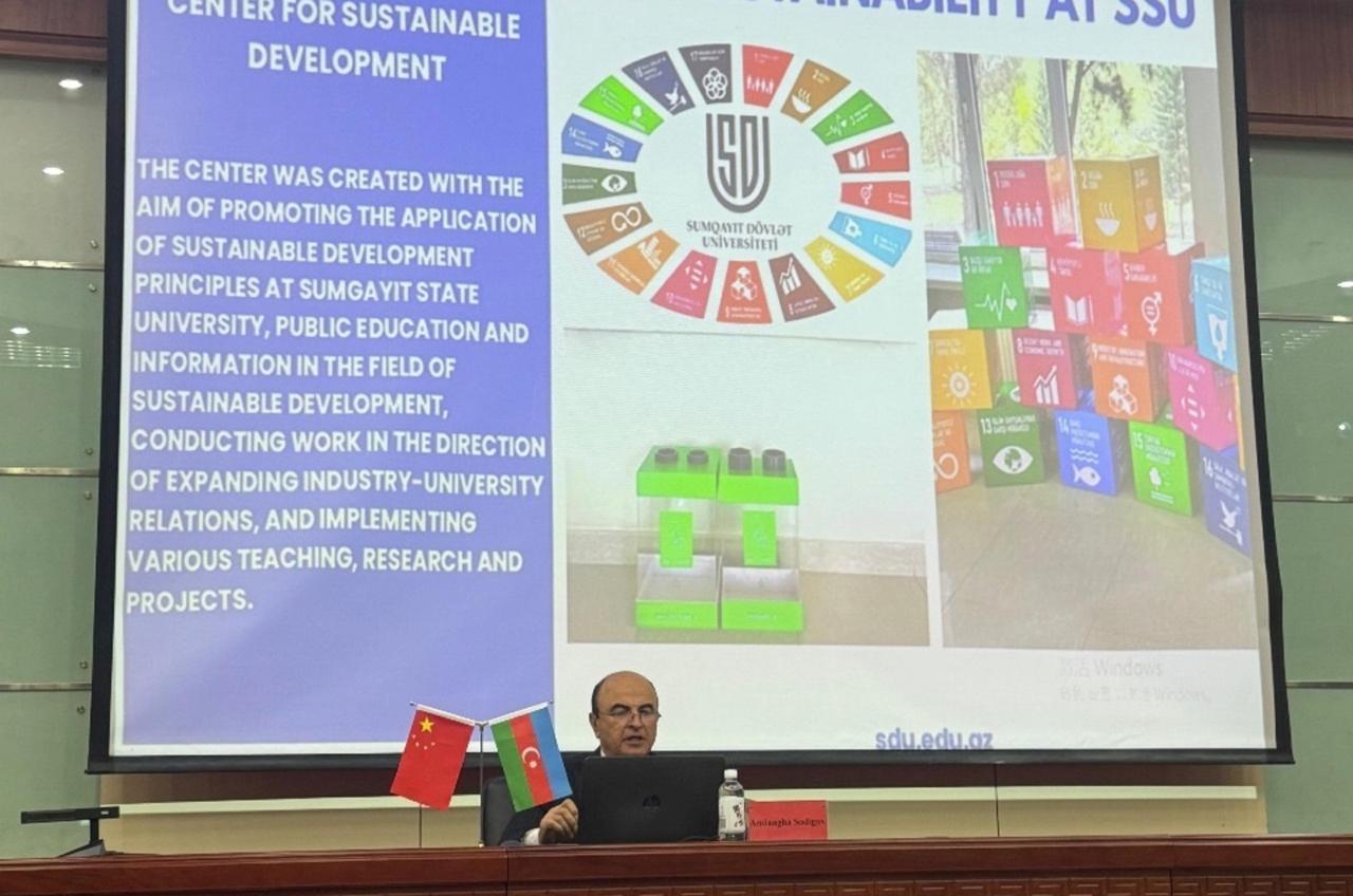 Sentyabrın 24-də Sumqayıt Dövlət Universitetinin (SDU) rektoru v.i.e., AMEA-nın müxbir üzvü, professor Əminağa Sadıqov Çin Xalq Respublikasına səfəri çərçivəsində Zhangye şəhərində yerləşən Heksi Universitetində professor-müəllim heyəti və tələbələr qarşısında təqdimatla çıxış edib. Təqdimat zamanı professor Əminağa Sadıqov SDU-nun təhsil proqramları, əsas akademik istiqamətləri, mövcud laboratoriyaları və beynəlxalq reytinqlərdə iştirakı barədə ətraflı məlumat verib. O, universitetin dayanıqlı inkişaf sahəsində həyata keçirdiyi layihələr və təşəbbüslərdən də söz açıb. O, çıxışında BMT-nin Dayanıqlı İnkişaf Məqsədlərinə (DİM) uyğun olaraq universitetdə görülən işlər, yaradılmış Dayanıqlı İnkişaf Mərkəzi, startap layihələri, beynəlxalq şəbəkələrdə üzvlük, 17 DİM üzrə həyata keçirilən fəaliyyət, təşviq olunan təşəbbüslər və qurulan tərəfdaşlıqlar barədə geniş təqdimat edib. Təqdimat tələbələr arasında böyük maraqla qarşılanıb, görüş zamanı onların çoxsaylı sualları cavablandırılıb və SDU ilə Heksi Universiteti arasında gələcək əməkdaşlıq perspektivləri müzakirə olunub.