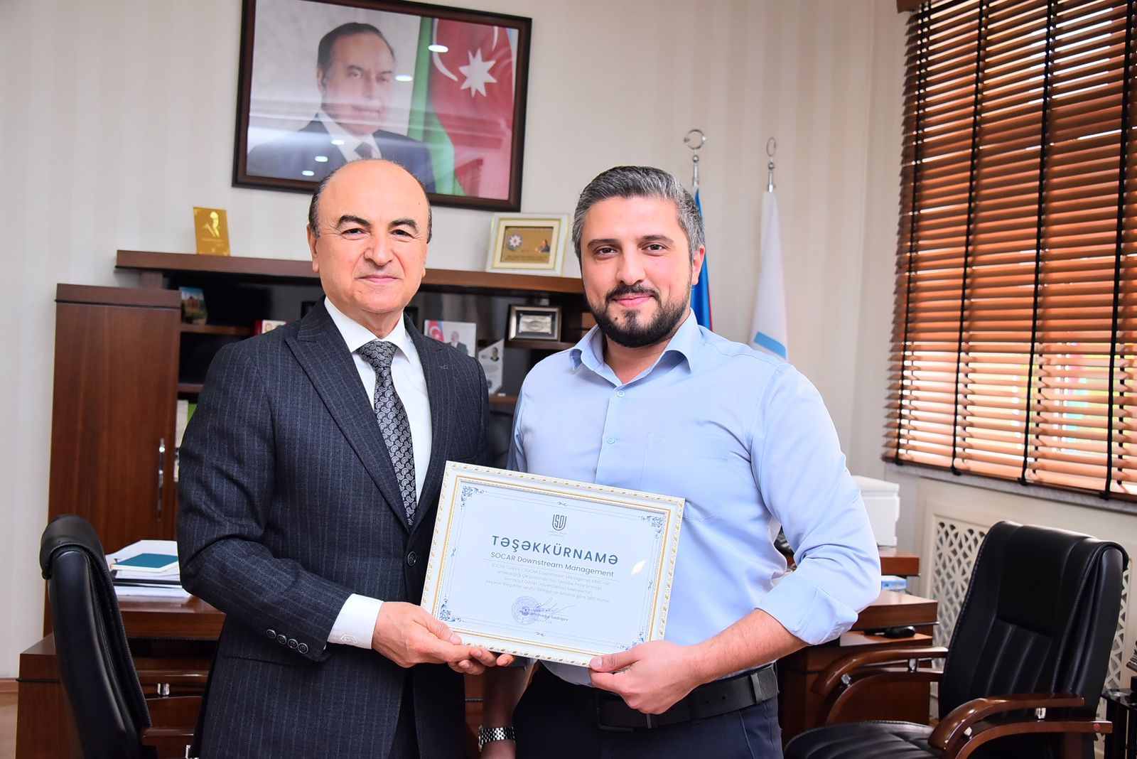 Görüşün sonunda “SOCAR Downstream Management” MMC-nin nümayəndəsi Maşallah İsgəndərova universitet rəhbərliyi tərəfindən təcrübə proqramında tələbələrə göstərdiyi dəstəyə və əməkdaşlığa görə təşəkkürnamə təqdim olunub.