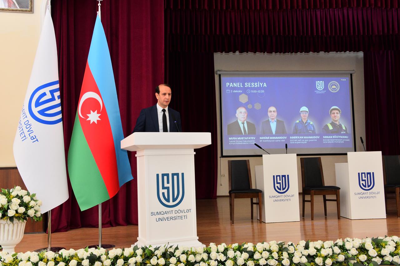 Tədbir Ümummilli Lider Heydər Əliyevin və ölkəmizin azadlığı uğrunda şəhid olmuş qəhrəmanlarımızın əziz xatirəsinin bir dəqiqəlik sükutla yad edilməsi və Dövlət Himninin səsləndirilməsi ilə başlayıb. Seminar SDU-nun TEC sədri Nübar Rəhimovanın moderatorluğu ilə təşkil olunub. Tədbiri SDU-nun Elm və innovasiyalar üzrə prorektoru, dosent Elşad Abdullayev açaraq iştirakçıları salamlayıb. Prorektor bildirib ki, seminarın təşəbbüsü Azərbaycan Dövlət Neft və Sənaye Universitetindən (ADNSU) gəlib və hazırda Azərbaycan Texniki Universiteti (AzTU), Azərbaycan Memarlıq və İnşaat Universiteti (AzMİU) və digər ali təhsil müəssisələrinin Tələbə Elmi Cəmiyyətlərinin üzvləri SDU-da bir araya gəliblər. Bu cür seminarların əsas məqsədi tələbələr arasında elmi əlaqələrin genişləndirilməsi, təcrübə və bilik mübadiləsinin təşviq edilməsidir. Elşad Abdullayev çıxışında Sumqayıtın böyük sənaye və iqtisadi potensialını vurğulayaraq bildirib ki, 76 illik inkişaf yolu keçmiş, ölkəmizin ikinci ən böyük sənaye mərkəzi olan Sumqayıtın yeganə ali təhsil müəssisəsi olan SDU-da belə elmi seminarların təşkili son dərəcə əhəmiyyətlidir. Məhz bu səbəbdən seminar “Neft və qazın emalında müasir yanaşmalar” mövzusuna həsr olunub. Prorektor həmçinin universitetin tədris fəaliyyəti, fakültələri, ixtisasları və son illərdə beynəlxalq reytinqlərdə əldə etdiyi uğurlar barədə məlumat verib. O bildirib ki, bu gün SDU-da 6500-dən çox tələbə təhsil alır və universitet geniş profilli ali təhsil müəssisəsi kimi müəllim, tədqiqatçı, iqtisadçı və mühəndis hazırlığı aparır. Sonra elmi seminar panel müzakirələri ilə davam edib. Spiker qismində: SDU-nun Kimya kafedrasının müdiri Musa Mustafayev, BP-Azərbaycanın sahə rəisi Nəsimi Məmmədov, SOCAR-ın neft və qaz çıxarma üzrə supervayzeri Səbirxan Mahmudov çıxış ediblər. Məruzəçilər akademik Yusif Məmmədəliyevin elmi irsinin Azərbaycan kimya elminin inkişafındakı müstəsna rolundan, onun çoxşaxəli fəaliyyətindən, ölkəmizdə neft və qaz sənayesinin inkişaf mərhələlərindən, ekologiya məsələlərindən, eləcə də dünyanın yaşıl enerji istiqamətində keçid prosesindən danışıblar. Həmçinin SOCAR və bp şirkətlərinin mövcud fəaliyyət istiqamətləri, yeni texnologiyaların tətbiqi və gələcək hədəfləri barədə məlumat verilib. Seminarın sonunda iştirakçılar SDU-nun Energetika Poliqonu ilə tanış olublar.