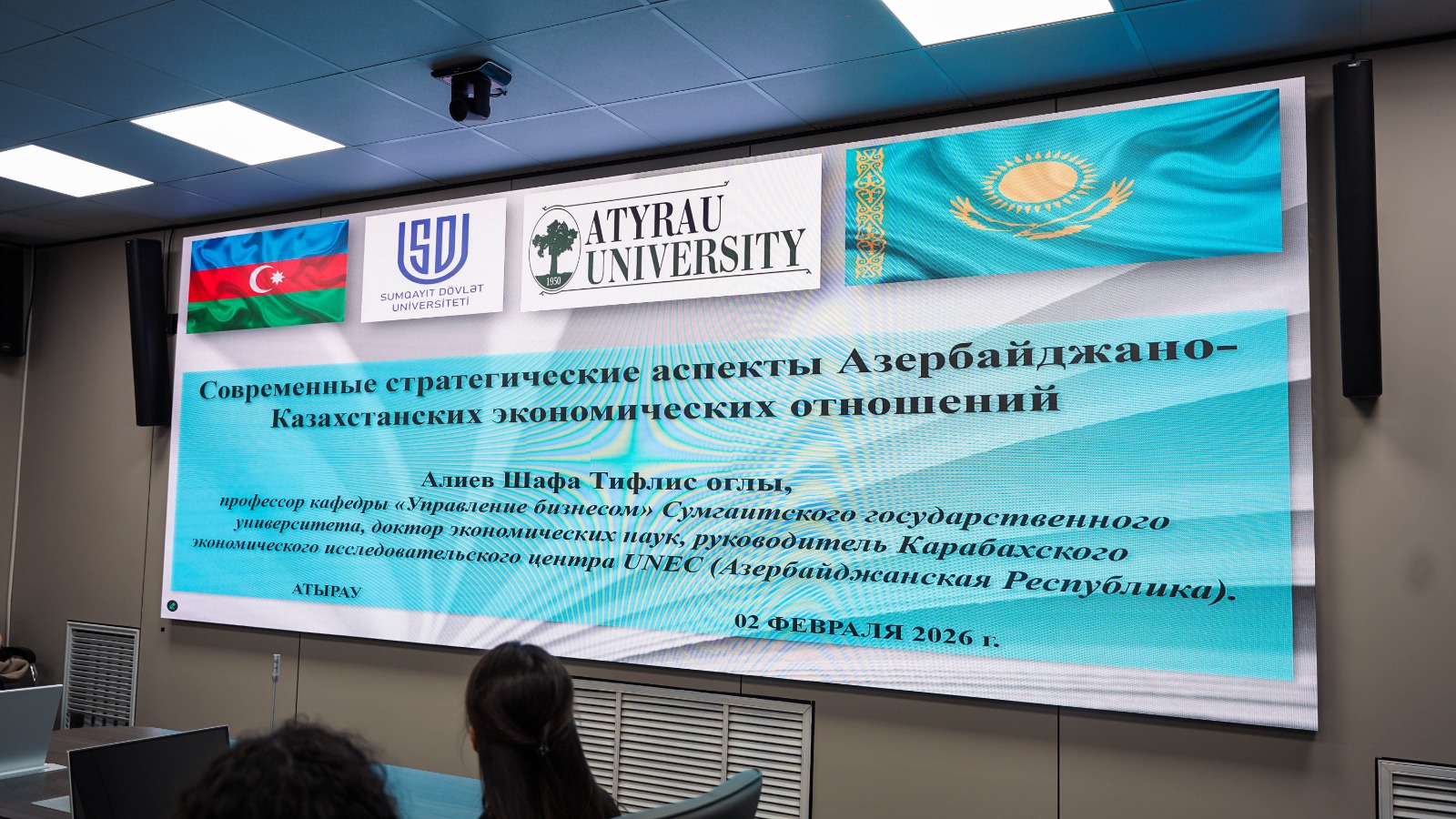 Tədbir çərçivəsində hazırda Sumqayıt Dövlət Universiteti (SDU) ilə Qazaxıstan Respublikasının Xalel Dosmuxamedov adına Atırau Dövlət Universiteti arasında həyata keçirilən akademik mübadilə proqramı çərçivəsində Qazaxıstanda səfərdə olan SDU-nun Biznesin idarə edilməsi kafedrasının professoru Şəfa Əliyev və Tarix, coğrafiya və metodika kafedrasının dosenti Yusifəli Həsənov çıxış ediblər. Şəfa Əliyev Azərbaycan-Qazaxıstan iqtisadi əlaqələrinin müasir strateji aspektlərinə həsr olunmuş geniş təqdimatla çıxış edərək iki ölkə arasında iqtisadi əməkdaşlığın perspektivlərini təhlil edib. Yusifəli Həsənov isə Azərbaycan və Qazaxıstan arasında təhsil və elm sahəsində əməkdaşlığın əhəmiyyətindən bəhs edərək, beynəlxalq Heydər Əliyev təqaüd proqramının uzunmüddətli, davamlı və uğurlu bir əməkdaşlıq modeli kimi xüsusi əhəmiyyət daşıdığını vurğulayıb.