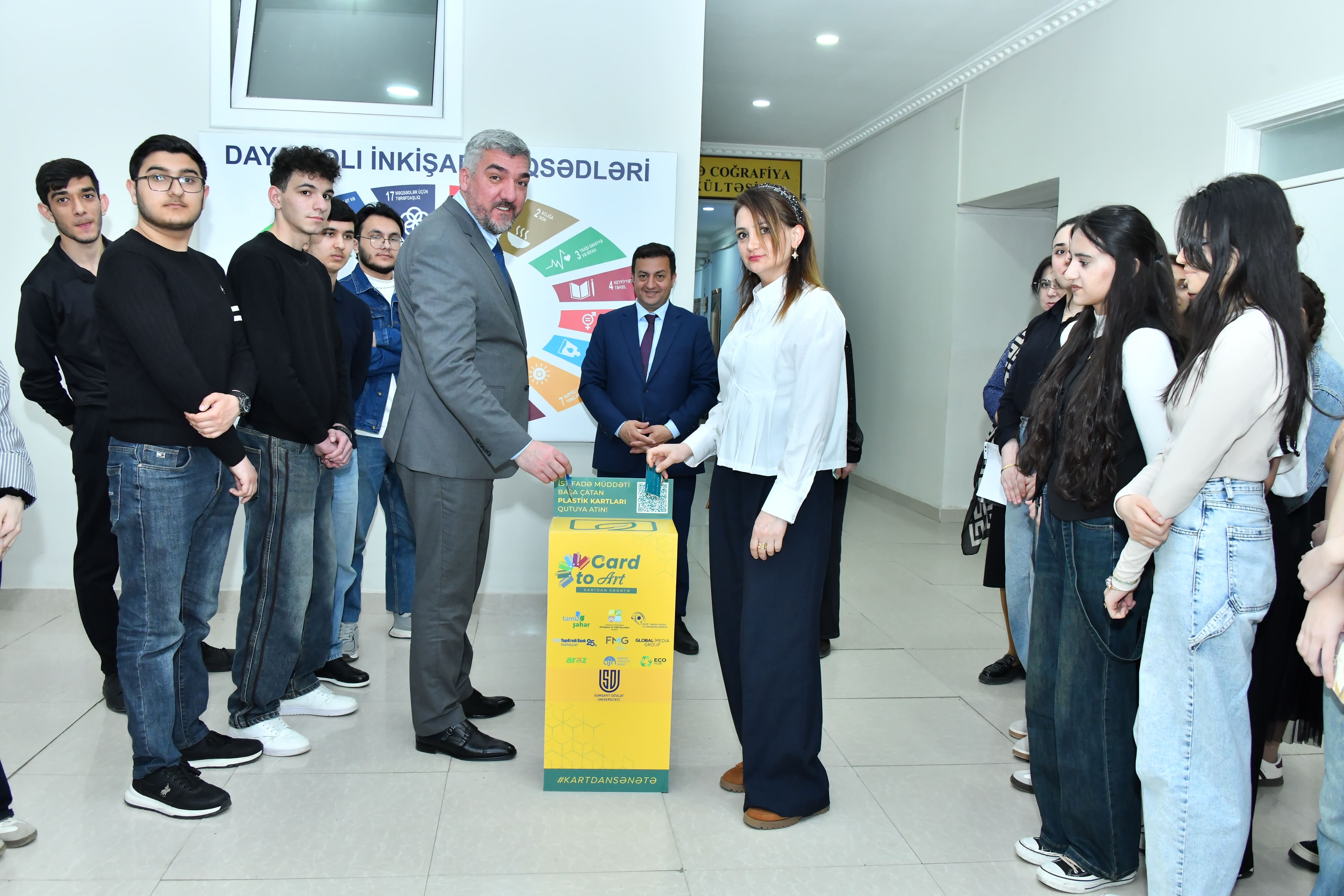 Aprelin 8-də Sumqayıt Dövlət Universitetində (SDU) Karyera və Məzunlarla iş Mərkəzinin təşkilatçılığı ilə “Card to Art” sosial layihəsinin təqdimatı baş tutub. “Təmiz Şəhər” ASC-nin təşəbbüsü ilə yaradılan, Yapı Kredi Bank Azərbaycanın tərəfdaş olduğu “Card to ART” (“Kartdan Sənətə”) sosial layihəsinin təqdimat mərasimi SDU Karyera və Məzunlarla iş Mərkəzinin direktoru Anar Dünyamalıyevin çıxışı ilə başladı. Mahiyyətində ekologiyamıza qayğı dayanan sosial layihəyə Sumqayıt Dövlət Universiteti əməkdaşları və tələbələrinin qoşulmasının yaddaqalan hadisə olduğunu deyən Mərkəz direktoru Universitetin “Təmiz Şəhər” ASC ilə əməkdaşlığından daha çox tələbələrin bəhrələndiyini bildirdi. “Təmiz Şəhər” ASC-nin şöbə müdiri Orxan Cabbarlı layihənin yaranma zərurəti barədə məlumat verdi. O, layihədə məqsədin sosial həyatımıza daxil olan müxtəlif təyinatlı plastik kartların istifadə müddəti başa çatandan sonra onların ekoloji mühitə ziyanvurma potensialından danışdı. Bildirildi ki, Layihənin məqsədi yararsız plastik kartların cəmiyyətimiz üçün faydalı etməkdir. Bunun üçün layihə çərçivəsində müxtəlif məkanlardakı qutularda toplanacaq plastik kartlar yaradıcı insanların əlində sənət əsərlərinə çevriləcək. O sənət əsərləri Heydər Əliyev Fondunun təşəbbüsü ilə yaradılan “Tullantıdan Sənətə” muzeyində təşkil ediləcək “Card to ART” sərgisində təqdim olunacaq.