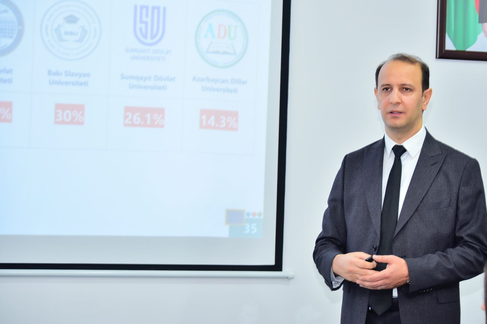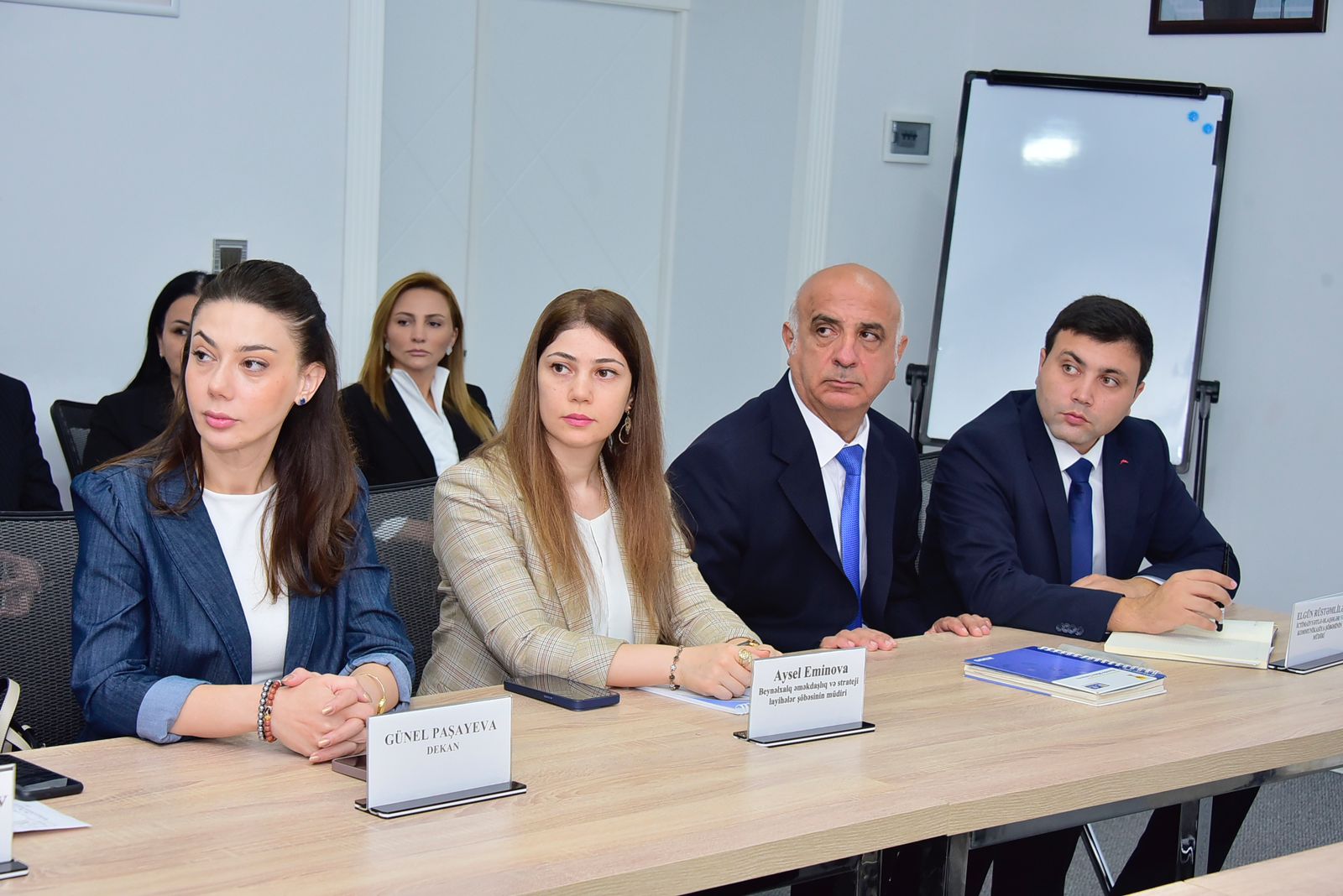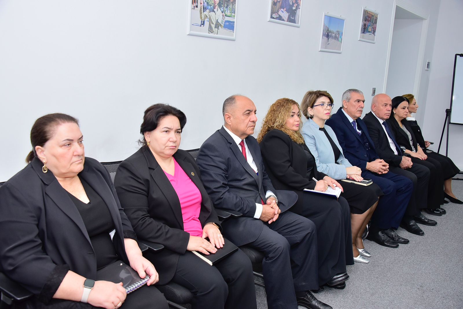 Vice-Rector for Science and Innovation, Associate Professor Elshad Abdullayev spoke at the meeting and provided detailed information about the admission plan for bachelor's, master's, and doctoral degrees across the country, based on data and statistics provided by the Ministry of Science and Education. He also touched upon issues such as optimizing admissions at the master's and doctoral levels, modernizing the content of the higher education system and increasing quality indicators, and ensuring the transition from quantity-based to quality-based funding in the higher education system. He also noted the achievements achieved in 2022–2025: 64,353 loans were formalized within the framework of the educational student loan system, 13,267 scientific articles were published in impact factor journals, and the number of students studying in SABAH and other new content programs was increased to 15,000. Then, explaining the goals planned for implementation by 2030, Elshad Abdullayev emphasized priorities such as optimizing coverage and accessibility in higher education, modernizing and improving the quality of higher education content, strengthening educational infrastructure within the framework of public-private partnerships, increasing the annual cost of education per student and equalizing tuition fees, and increasing coverage and accessibility across regions. Then, Aysel Eminova, Head of the Department of International Cooperation and Strategic Projects, brought to attention the analysis and recommendations of the Ministry of Science and Education on “Position of Azerbaijani Higher Education Institutions in International Rankings and Prioritization of Science”, provided information on the results of the QS 2026 Global Ranking, and spoke about the results of scientific research on Azerbaijan in the Scopus elemmetric database. Aysel Eminova provided information on the criteria of international rating systems, the internationalization of scientific activity, as well as the measures taken by SSU in this direction. At the end of the meeting, a wide exchange of views was held among the participants, proposals were made on the issues discussed, and directions of action for the upcoming period were determined.