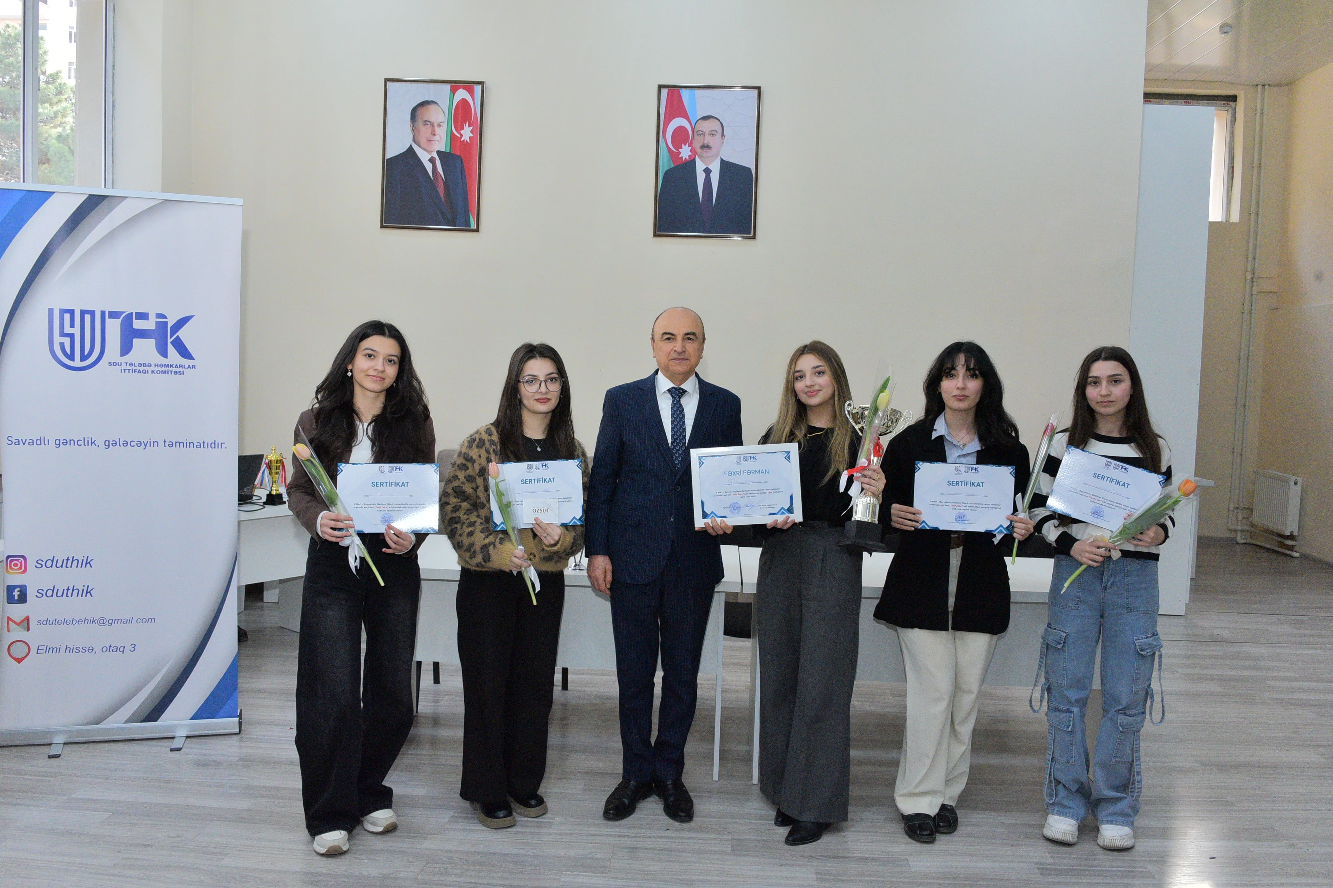 These days, as in other parts of the world, a series of events are being organized at Sumgayit State University (SSU) on the occasion of International Women's Day. On March 5, an intellectual competition called “Delicate Intelligence” was held among female students dedicated to March 8 - International Women's Day, organized by the Student Trade Union Committee (STUC) of SSU at the Library Information Center of Sumgayit State University. Before the competition, Acting Rector of SSU, Corresponding Member of ANAS Aminaga Sadigov made a speech and sincerely congratulated the female students on the occasion of this significant day. He noted that the Azerbaijani woman has a special position in society. She is a kind mother, a caring wife, and a person who performs responsible duties in various fields and in public administration with dignity. Aminaga Sadigov also emphasized that getting a good education and the knowledge and skills acquired at the university he attends follow a person throughout his life. Thanks to this knowledge, your worldview expands, your intellectual level is formed. It is precisely as a result of this that the recent achievements of our graduates are highly appreciated, and this is a source of great pride for our university. At the end of his speech, he wished success to the female students participating in the competition and wished them success in their future activities. Then, the chairman of the STUC, Elmin Novruzlu made a speech and informed the participants about the conditions and rules of the competition. He said that 7 teams participated in the intellectual competition, which consisted of three stages and 12 questions in each stage. Then the competition started. In the competition, which was held in a tense and interesting competitive environment, the team of the Faculty of History and Geography took first place, the team of the Faculty of Magistracy took second place, and the team of the Faculty of Economics and Management took third place. Finally, the winning teams were presented with a cup, honorary diplomas and gifts.