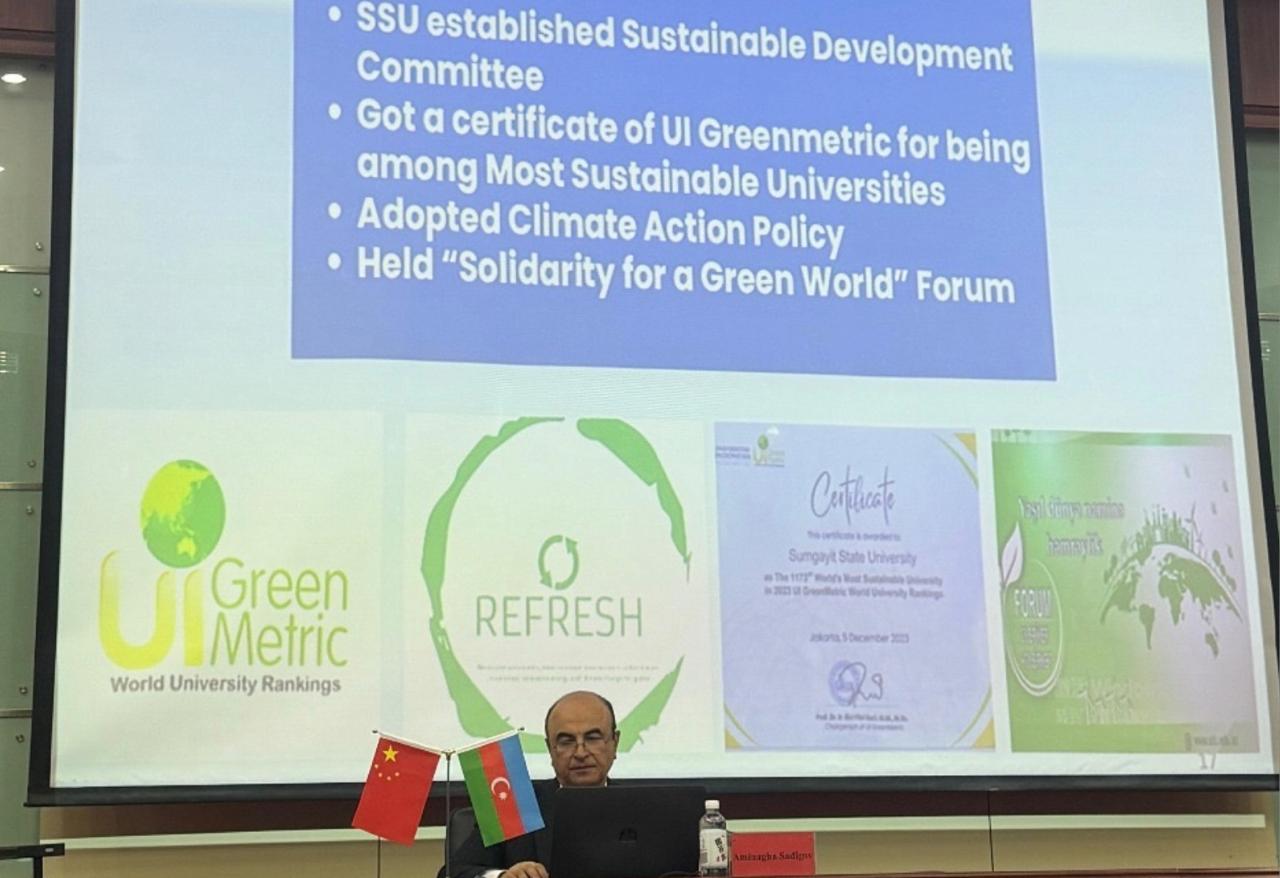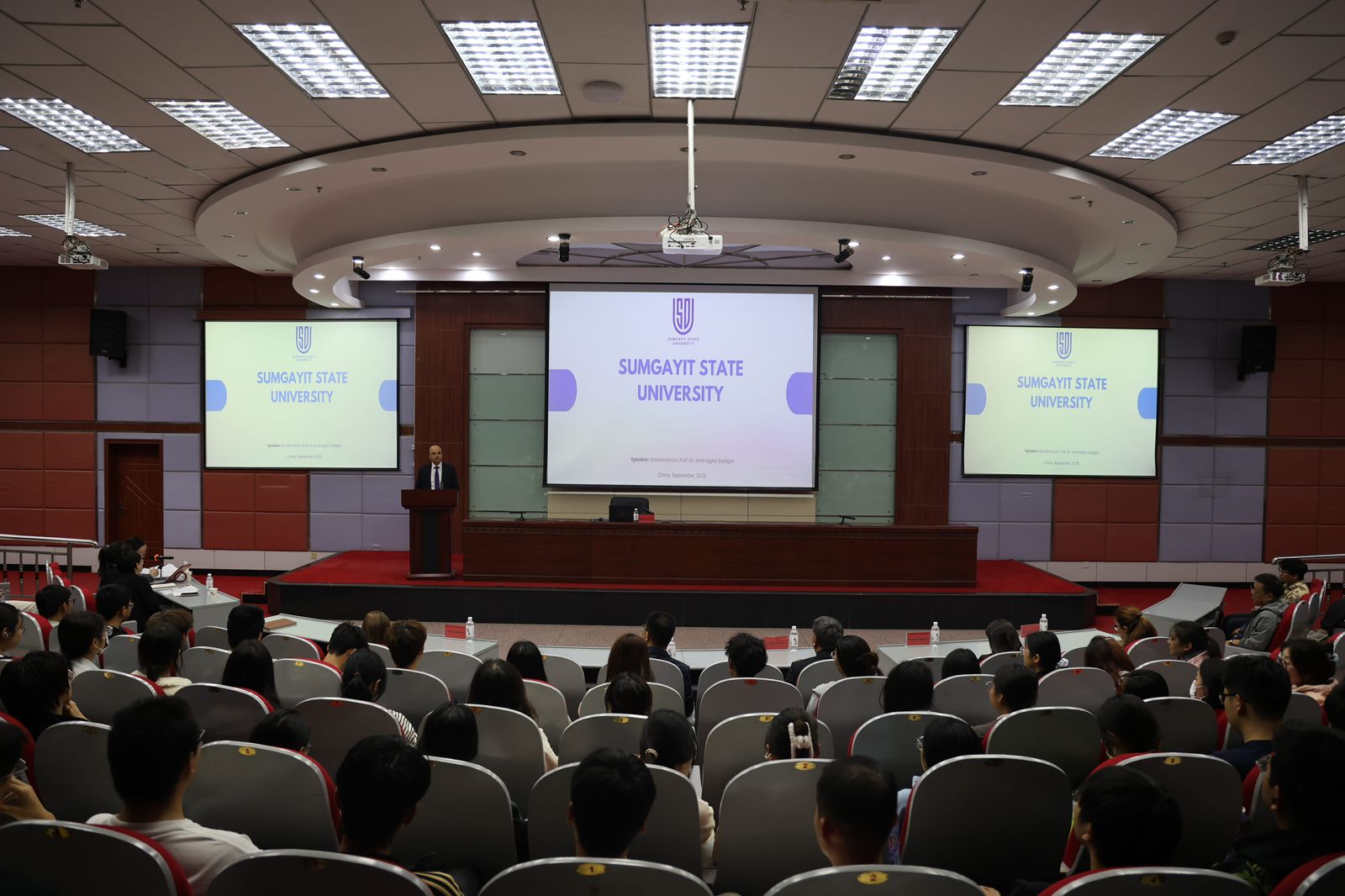 Sentyabrın 24-də Sumqayıt Dövlət Universitetinin (SDU) rektoru v.i.e., AMEA-nın müxbir üzvü, professor Əminağa Sadıqov Çin Xalq Respublikasına səfəri çərçivəsində Zhangye şəhərində yerləşən Heksi Universitetində professor-müəllim heyəti və tələbələr qarşısında təqdimatla çıxış edib. Təqdimat zamanı professor Əminağa Sadıqov SDU-nun təhsil proqramları, əsas akademik istiqamətləri, mövcud laboratoriyaları və beynəlxalq reytinqlərdə iştirakı barədə ətraflı məlumat verib. O, universitetin dayanıqlı inkişaf sahəsində həyata keçirdiyi layihələr və təşəbbüslərdən də söz açıb. O, çıxışında BMT-nin Dayanıqlı İnkişaf Məqsədlərinə (DİM) uyğun olaraq universitetdə görülən işlər, yaradılmış Dayanıqlı İnkişaf Mərkəzi, startap layihələri, beynəlxalq şəbəkələrdə üzvlük, 17 DİM üzrə həyata keçirilən fəaliyyət, təşviq olunan təşəbbüslər və qurulan tərəfdaşlıqlar barədə geniş təqdimat edib. Təqdimat tələbələr arasında böyük maraqla qarşılanıb, görüş zamanı onların çoxsaylı sualları cavablandırılıb və SDU ilə Heksi Universiteti arasında gələcək əməkdaşlıq perspektivləri müzakirə olunub.