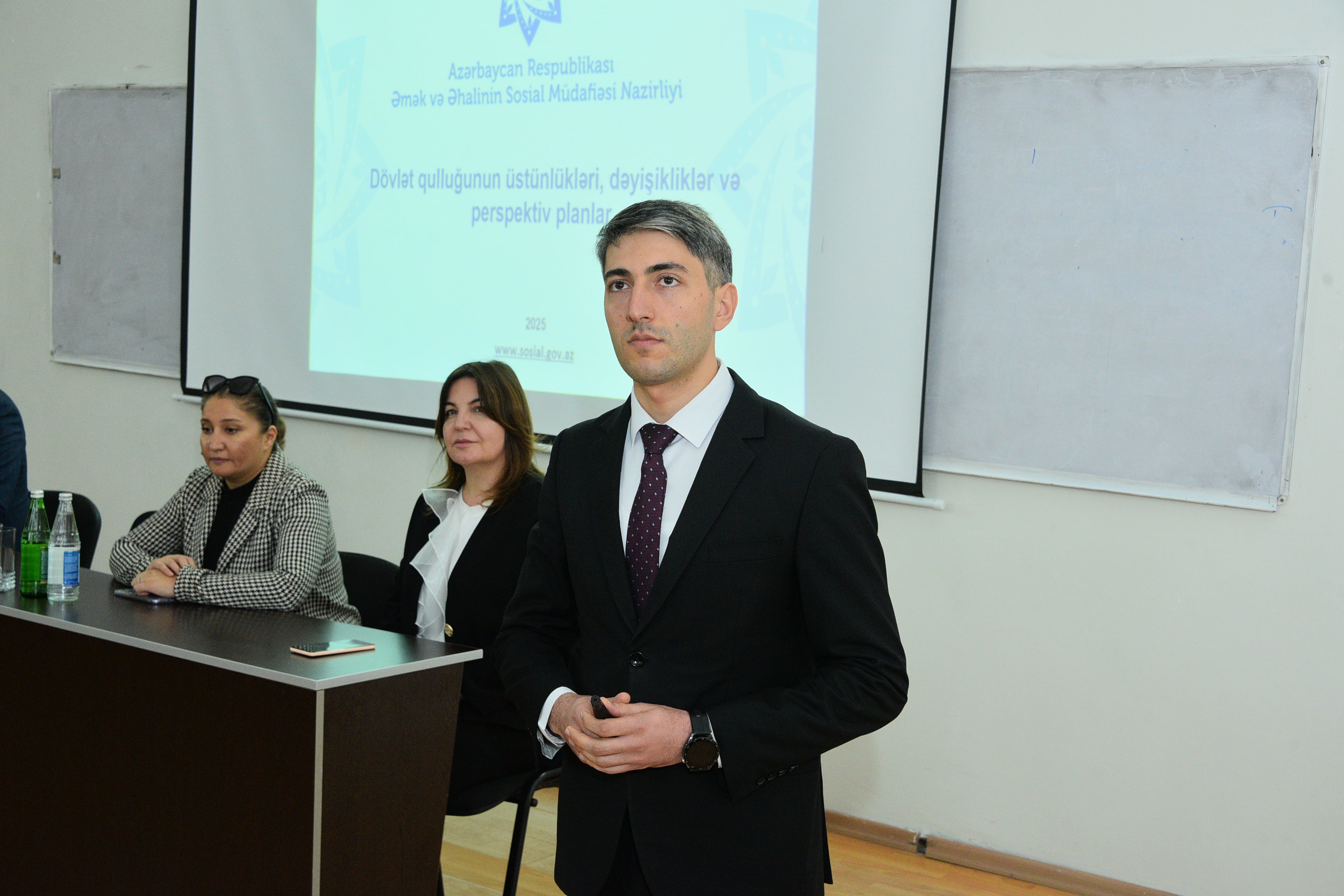 Noyabrın 14-də Sumqayıt Dövlət Universitetində Azərbaycan Respublikasının Əmək və Əhalinin Sosial Müdafiəsi Nazirliyinin (ƏƏSMN) əməkdaşlarının iştirakı ilə “Dövlət qulluğunun üstünlükləri, dəyişikliklər və perspektiv planlar” mövzusunda maarifləndirici seminar təşkil olunub. Tədbiri Karyera və Məzunlarla İş Mərkəzinin müdiri Anar Dünyamalıyev açaraq qonaqları salamlayıb və seminarın məqsədi barədə iştirakçılara məlumat verib. O, tədbirin gənclərdə dövlət qulluğuna marağın artırılması, tələbələrin bu sahə ilə bağlı bilgilərlə təmin olunması və onların gələcək karyera planlaşdırmasına dəstək göstərilməsi baxımından mühüm əhəmiyyət daşıdığını vurğulayıb. Sonra Əmək və Əhalinin Sosial Müdafiəsi Nazirliyinin baş məsləhətçisi Həsənağa Hüseynov çıxış edərək ölkəmizdə dövlət qulluğu sisteminin hüquqi bazası, dövlət qulluqçuları üçün mövcud təminatlar, qəbul prosedurları, imtahan və seçim mexanizmləri, müsabiqə mərhələləri barədə məlumat verib. O, dövlət qulluğuna qəbul prosesinin şəffaflıq və bərabər imkanlar prinsipləri əsasında həyata keçirildiyini bildirib, gənclərin dövlət idarəçiliyində artan rolundan danışıb. Seminar interaktiv şəkildə davam edib, tələbələrin çoxsaylı sualları cavablandırılıb. Gənclərə dövlət qulluğuna hazırlıq, imtahan strategiyaları və karyera inkişafı ilə bağlı bir sıra tövsiyələr verilib.