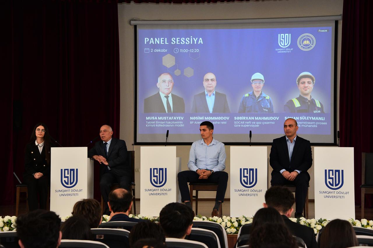 Tədbir Ümummilli Lider Heydər Əliyevin və ölkəmizin azadlığı uğrunda şəhid olmuş qəhrəmanlarımızın əziz xatirəsinin bir dəqiqəlik sükutla yad edilməsi və Dövlət Himninin səsləndirilməsi ilə başlayıb. Seminar SDU-nun TEC sədri Nübar Rəhimovanın moderatorluğu ilə təşkil olunub. Tədbiri SDU-nun Elm və innovasiyalar üzrə prorektoru, dosent Elşad Abdullayev açaraq iştirakçıları salamlayıb. Prorektor bildirib ki, seminarın təşəbbüsü Azərbaycan Dövlət Neft və Sənaye Universitetindən (ADNSU) gəlib və hazırda Azərbaycan Texniki Universiteti (AzTU), Azərbaycan Memarlıq və İnşaat Universiteti (AzMİU) və digər ali təhsil müəssisələrinin Tələbə Elmi Cəmiyyətlərinin üzvləri SDU-da bir araya gəliblər. Bu cür seminarların əsas məqsədi tələbələr arasında elmi əlaqələrin genişləndirilməsi, təcrübə və bilik mübadiləsinin təşviq edilməsidir. Elşad Abdullayev çıxışında Sumqayıtın böyük sənaye və iqtisadi potensialını vurğulayaraq bildirib ki, 76 illik inkişaf yolu keçmiş, ölkəmizin ikinci ən böyük sənaye mərkəzi olan Sumqayıtın yeganə ali təhsil müəssisəsi olan SDU-da belə elmi seminarların təşkili son dərəcə əhəmiyyətlidir. Məhz bu səbəbdən seminar “Neft və qazın emalında müasir yanaşmalar” mövzusuna həsr olunub. Prorektor həmçinin universitetin tədris fəaliyyəti, fakültələri, ixtisasları və son illərdə beynəlxalq reytinqlərdə əldə etdiyi uğurlar barədə məlumat verib. O bildirib ki, bu gün SDU-da 6500-dən çox tələbə təhsil alır və universitet geniş profilli ali təhsil müəssisəsi kimi müəllim, tədqiqatçı, iqtisadçı və mühəndis hazırlığı aparır. Sonra elmi seminar panel müzakirələri ilə davam edib. Spiker qismində: SDU-nun Kimya kafedrasının müdiri Musa Mustafayev, BP-Azərbaycanın sahə rəisi Nəsimi Məmmədov, SOCAR-ın neft və qaz çıxarma üzrə supervayzeri Səbirxan Mahmudov çıxış ediblər. Məruzəçilər akademik Yusif Məmmədəliyevin elmi irsinin Azərbaycan kimya elminin inkişafındakı müstəsna rolundan, onun çoxşaxəli fəaliyyətindən, ölkəmizdə neft və qaz sənayesinin inkişaf mərhələlərindən, ekologiya məsələlərindən, eləcə də dünyanın yaşıl enerji istiqamətində keçid prosesindən danışıblar. Həmçinin SOCAR və bp şirkətlərinin mövcud fəaliyyət istiqamətləri, yeni texnologiyaların tətbiqi və gələcək hədəfləri barədə məlumat verilib. Seminarın sonunda iştirakçılar SDU-nun Energetika Poliqonu ilə tanış olublar.