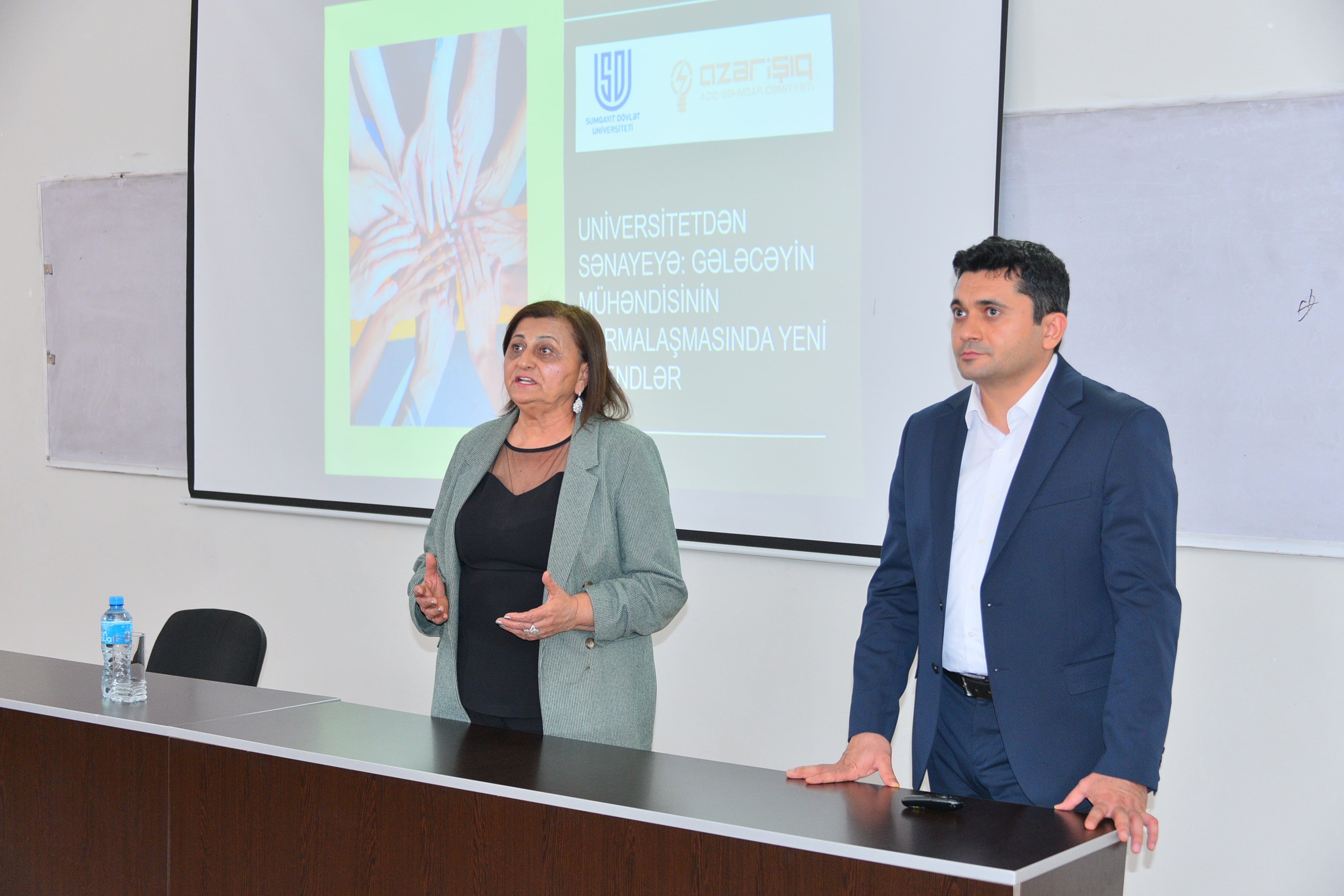 Dekabrın 15-də Sumqayıt Dövlət Universitetində (SDU) Azərişıq ASC-nin Tədris və İnnovasiyalar Mərkəzi tərəfindən tələbələr üçün infosessiyalar təşkil olunub. Tədbirdə Tədris və İnnovasiyalar Mərkəzinin Texnoloji innovasiyalar kafedrasının Beyin Məkəzinin müdiri, spiker Fərid Zalıyev, aparıcı mütəxəssis Tariq Hüseynov, mütəxəssis Zərifə Babayeva və universitetin müəllim və tələbələri iştirak ediblər. Tədbiri giriş sözü ilə açan universitetin Sosial məsələlər və ictimaiyyətlə əlaqələr üzrə prorektoru, dosent Elmar Xəlilov ölkəmizin regional və qlobal miqyasda nəhəng enerji layihələrinin təşəbbüskarı və fəal iştirakçısı olduğunu vurğulayıb. O, bu istiqamətdə ali təhsil müəssisələrinin, xüsusilə də Sumqayıt Dövlət Universitetinin üzərinə düşən mühüm vəzifələrdən danışıb. Elmar Xəlilov Azərişıq ASC-nin Tədris və İnnovasiyalar Mərkəzi ilə SDU arasında formalaşmış səmərəli əməkdaşlıq münasibətlərinə toxunaraq qeyd edib ki, bu əməkdaşlıq tələbələrin bilik və bacarıqlarının real istehsalat mühitində formalaşmasına mühüm töhfə verir. Prorektor həmçinin 44 günlük Vətən müharibəsində qazanılmış tarixi Zəfərdən sonra işğaldan azad edilmiş ərazilərdə dağıdılmış enerji infrastrukturunun yenidən qurulması və bərpası məqsədilə həyata keçirilən genişmiqyaslı layihələrdən danışıb. Sonra spiker Fərid Zalıyev çıxış edərək təmsil etdiyi mərkəzin fəaliyyəti haqqında məlumat verib. O, “Universitetdən sənayeyə: Gələcəyin mühəndisinin formalaşmasında yeni trendlər” mövzusunda təqdimatla çıxış edərək Azərbaycanın enerji siyasəti və perspektivləri, elektroenergetika sistemi və paylayıcı sistem operatorunun rolu, sənaye-universitet əməkdaşlığı və bu əməkdaşlığın kadr potensialının artırılmasındakı əhəmiyyəti, eləcə də motivasiya və peşəkar inkişaf mövzularına toxunub. Tədbir interaktiv formatda keçirilib, iştirakçılar mövzu ətrafında fikir mübadiləsi aparıb və sorğuda iştirak ediblər. Qeyd edək ki, infosessiya gün ərzində davam edib.