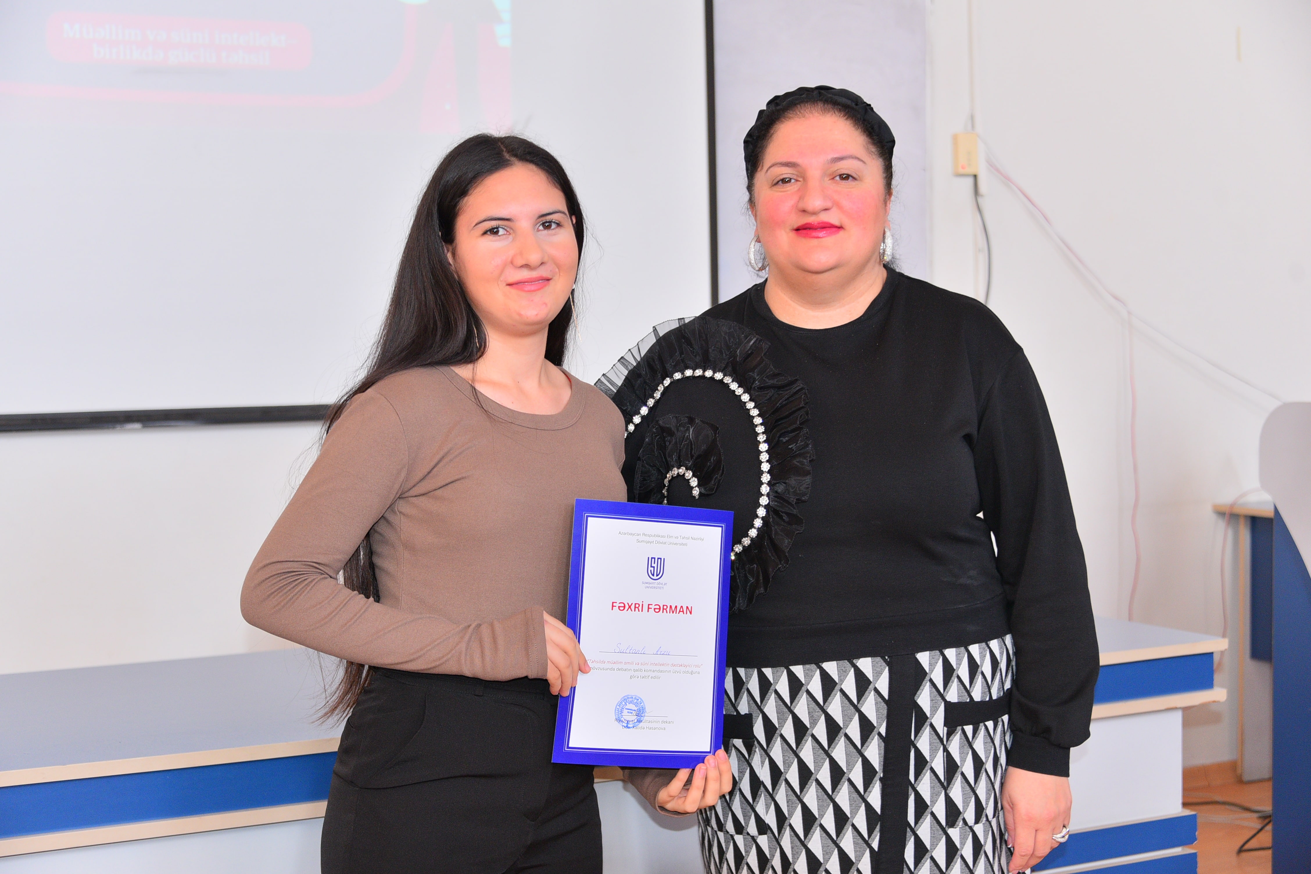 Dekabrın 18-də Riyaziyyat və informatikanın tədrisi texnologiyası kafedrası və Tələbə Elmi Cəmiyyətin birgə təşkilatçılığı ilə “Təhsildə müəllim amili və süni intellektin dəstəkləyici rolu” mövzusunda debat təşkil olunub. Debatı kafedranın müdiri, dosent Məftun Heydərova açaraq iştirakçıları salamlayıb, mövzunun aktuallığını vurğulayıb. O, çıxışında süni intellektin təhsil sistemində müəllim fəaliyyətini necə dəstəklədiyini, tədris keyfiyyətinin artırılmasında yaratdığı imkanları və bu sahədə qarşıya çıxan əsas çağırışları diqqətə çatdırıb. Debatda hər biri 3 nəfərdən ibarət olmaqla Təsdiq və İnkar komandaları iştirak ediblər. Komandalar 5 dəqiqəlik çıxışları ilə mövqelərini təqdim edib, daha sonra qarşılıqlı arqument mübadiləsi və sual-cavab mərhələsi keçirilib. Auditoriyadan ünvanlanan suallar müzakirələri daha da genişləndirib, iştirakçılar arqumentlərini əlavə faktlar və əsaslandırmalarla gücləndiriblər. Debatın sonunda çıxışlar münsiflər heyəti tərəfindən qiymətləndirilib. Qiymətləndirmə meyarlarına məzmunun dolğunluğu, arqumentlərin əsaslandırılması, nitq mədəniyyəti və qarşı arqumentlərə cavab vermək bacarığı daxil olub. Münsiflərin qərarı ilə İnkar komandası qalib seçilərək Fəxri fərmanlarla mükafatlandırılıblar. Tədbirin digər iştirakçılarına isə təşəkkürnamələr təqdim olunubdur. Tədbirin davamında debatın gedişi və nəticələri üzrə SWOT analizi aparılıb. Bu mərhələdə Tələbə Elmi Cəmiyyətinin sədri Zərifə Səmədzadə çıxış edərək debatın elmi və təşkilati tərəflərini təhlil edib, tələbələrin fəallığını yüksək qiymətləndirib və belə formatlı intellektual müzakirələrin tələbə-elmi mühitinin formalaşmasında mühüm rol oynadığını vurğulayıb. O, həmçinin Tələbə Elmi cəmiyyətin gələcəkdə də bu tip elmi və polemik tədbirlərin təşkili istiqamətində fəaliyyətini davam etdirəcəyini bildirib. Sonda fakültə dekanı, dosent Xalidə Həsənova çıxış edərək iştirakçıları təbrik edib, belə intellektual və elmi debatların tələbələrin analitik düşünmə, tənqidi yanaşma və ünsiyyət bacarıqlarının inkişafında mühüm rol oynadığını vurğulayıb.