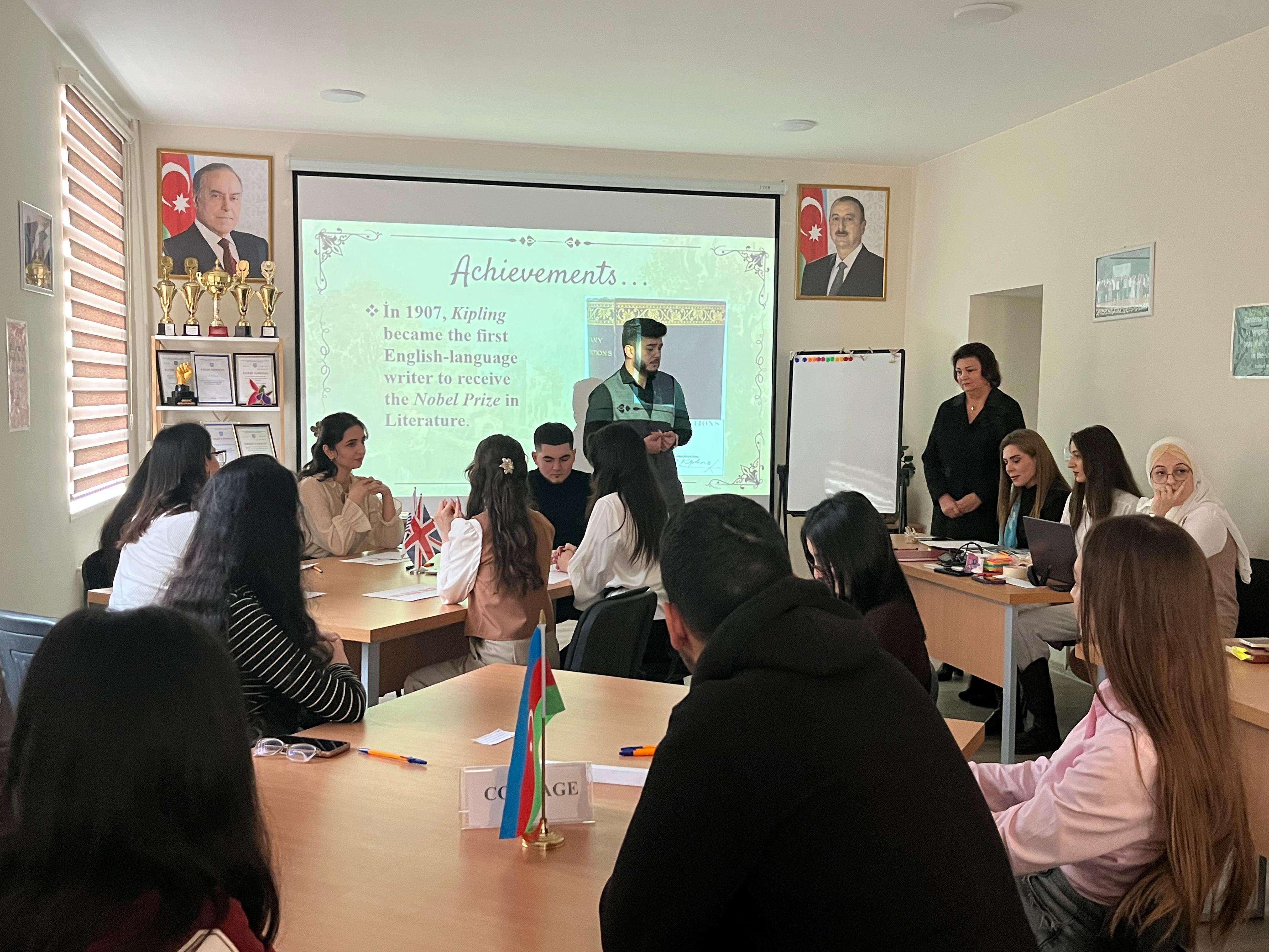 Dekabrın 18-də Filologiya fakültəsində dünya ədəbiyyatının görkəmli nümayəndəsi, Nobel mükafatı laureatı Rudyard Kiplinqin anadan olmasının 160-cı ildönümünə həsr olunmuş “Müasir təlimdə Kiplinq metodu” (5W1H) mövzusunda müştərək dərs keçirilib. Dərs Xarici dillər kafedrasının baş müəllimi Səadət Xəlilova və Dil və ədəbiyyat kafedrasının baş müəllimi Aynurə Bağırova tərəfindən aparılıb. Tədbirdə Kiplinqin həyat və yaradıcılığı müasir təlim yanaşmaları əsasında təqdim olunub, 5W1H metodunun pedaqoji prosesdə tətbiq imkanları nümayiş etdirilib. İnteraktiv formatda keçirilən dərs zamanı tələbələrin analitik və tənqidi düşünmə, mətnlə iş bacarıqlarının inkişafına xüsusi diqqət yetirilib. Fənlərarası inteqrasiya və innovativ təlim strategiyaları baxımından əhəmiyyətli olan dərs tələbələrin mövzuya marağını artırıb və refleksiya mərhələsi ilə yekunlaşıb. Tədbirdə Filologiya fakültəsinin dekanı dosent Günel Paşayeva, Xarici dillər kafedrasının müdiri Jalə Məmmədova, Dil və ədəbiyyat kafedrasının müdiri dosent Böyükxanım Eminli və fakültənin professor-müəllim heyəti iştirak ediblər.