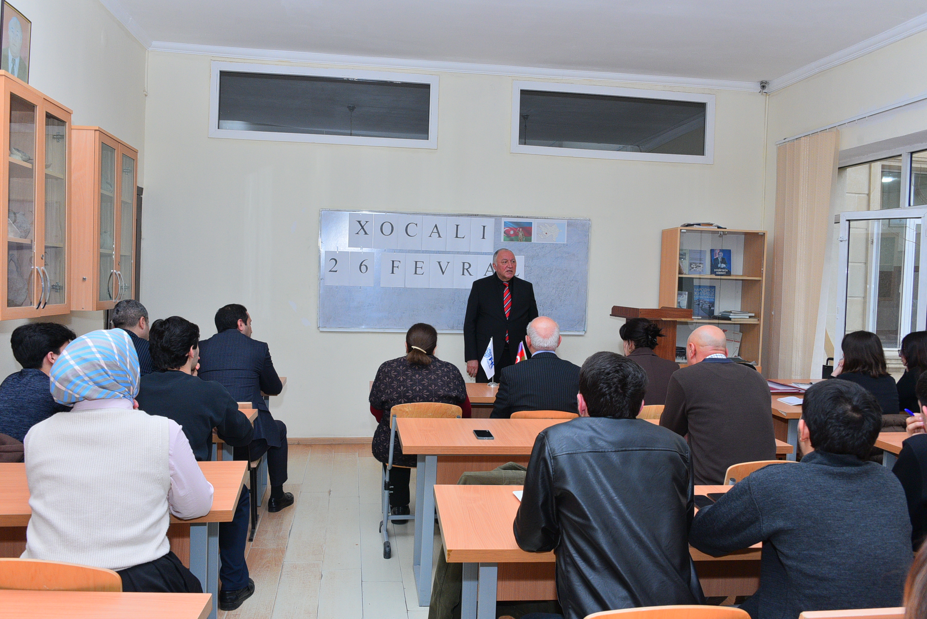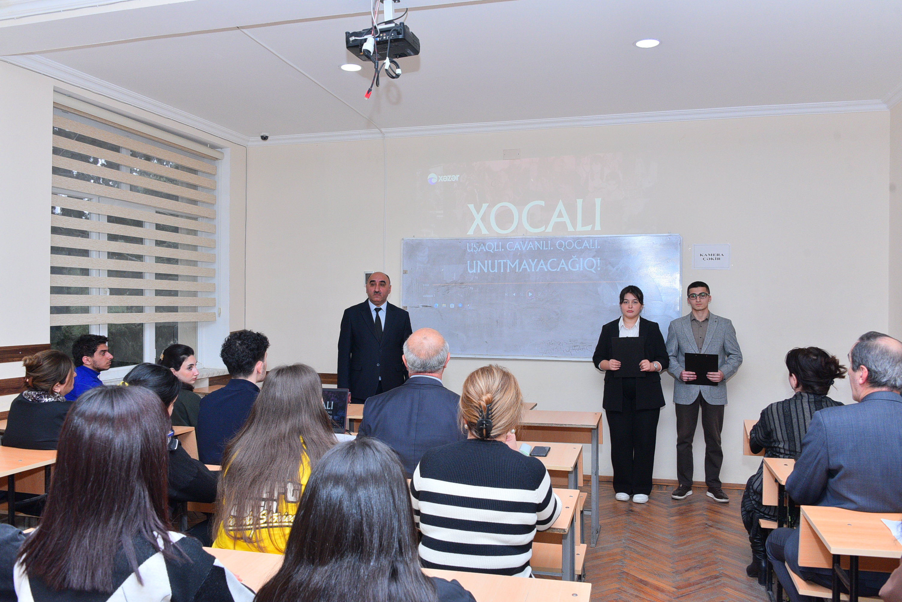 Əvvəlcə Xocalı faciəsində həyatını itirən günahsız insanların və Azərbaycanın ərazi bütövlüyü uğrunda şəhid olmuş bütün qəhrəmanların ruhu bir dəqiqəlik sükutla yad edilib. Ardınca Xocalı faciəsi qurbanlarının xatirəsinə həsr olunmuş videoçarx nümayiş etdirilib. Çıxışçılar Xocalı faciəsinin dinc əhaliyə qarşı törədilmiş ağır beynəlxalq cinayət olduğunu vurğulayaraq, bu hadisənin erməni millətçilərinin mahiyyətini dünya ictimaiyyətinə göstərdiyini bildiriblər. Qeyd olunub ki, Xocalı faciəsi ilə bağlı həqiqətlərin dünya ictimaiyyətinə çatdırılması yalnız Ümummilli Lider Heydər Əliyevin 1993-cü ildə siyasi hakimiyyətə qayıdışından sonra mümkün olmuşdur. Daha sonra Prezident İlham Əliyevin prinsipial və ardıcıl xarici siyasəti nəticəsində beynəlxalq müstəvidə Ermənistanın işğalçı siyasətinə dair mühüm sənədlər qəbul edilmiş, Xocalı faciəsinin tanıdılması istiqamətində əhəmiyyətli addımlar atılmışdır. 2008-ci ildə Heydər Əliyev Fondunun vitse-prezidenti Leyla Əliyevanın təşəbbüsü ilə başlanan “Xocalıya ədalət” beynəlxalq kampaniyası bu həqiqətlərin dünyaya çatdırılmasında mühüm rol oynamışdır. Artıq üç ildir ki, Xocalı faciəsinin ildönümü fərqli tarixi şəraitdə qeyd olunur. Xocalı şəhərinin işğaldan azad edilməsi ilə tarixi ədalət bərpa edilib. Bu gün azad Xocalıda dalğalanan Azərbaycan bayrağı faciə qurbanlarının xatirəsinə göstərilən ən ali ehtiramın rəmzidir. Hazırda işğaldan azad edilmiş ərazilərdə genişmiqyaslı bərpa və quruculuq işləri həyata keçirilir, Böyük Qayıdış prosesi uğurla davam edir. Natiqlər həmçinin Prezident İlham Əliyevin və Birinci vitse-prezident Mehriban xanım Əliyevanın Xocalıya səfərlərindən, kənd sakinləri ilə görüşlərindən, dövlət başçısının Xocalı Soyqırımı Memorial Kompleksinin yaradılması haqqında imzaladığı sərəncamdan bəhs ediblər. Vətən uğrunda canlarından keçən şəhidlər heç vaxt unudulmayacaq, onların qəhrəmanlığı gələcək nəsillər üçün vətənpərvərlik və fədakarlıq nümunəsi olaraq yaşayacaqdır. Tələbələr də məruzələrlə çıxış edərək Xocalı faciəsinin xalqımızın yaddaşında silinməz iz qoyduğunu bildirib, bu hadisəni insanlığa qarşı yönəlmiş amansız cinayət kimi səciyyələndiriblər.