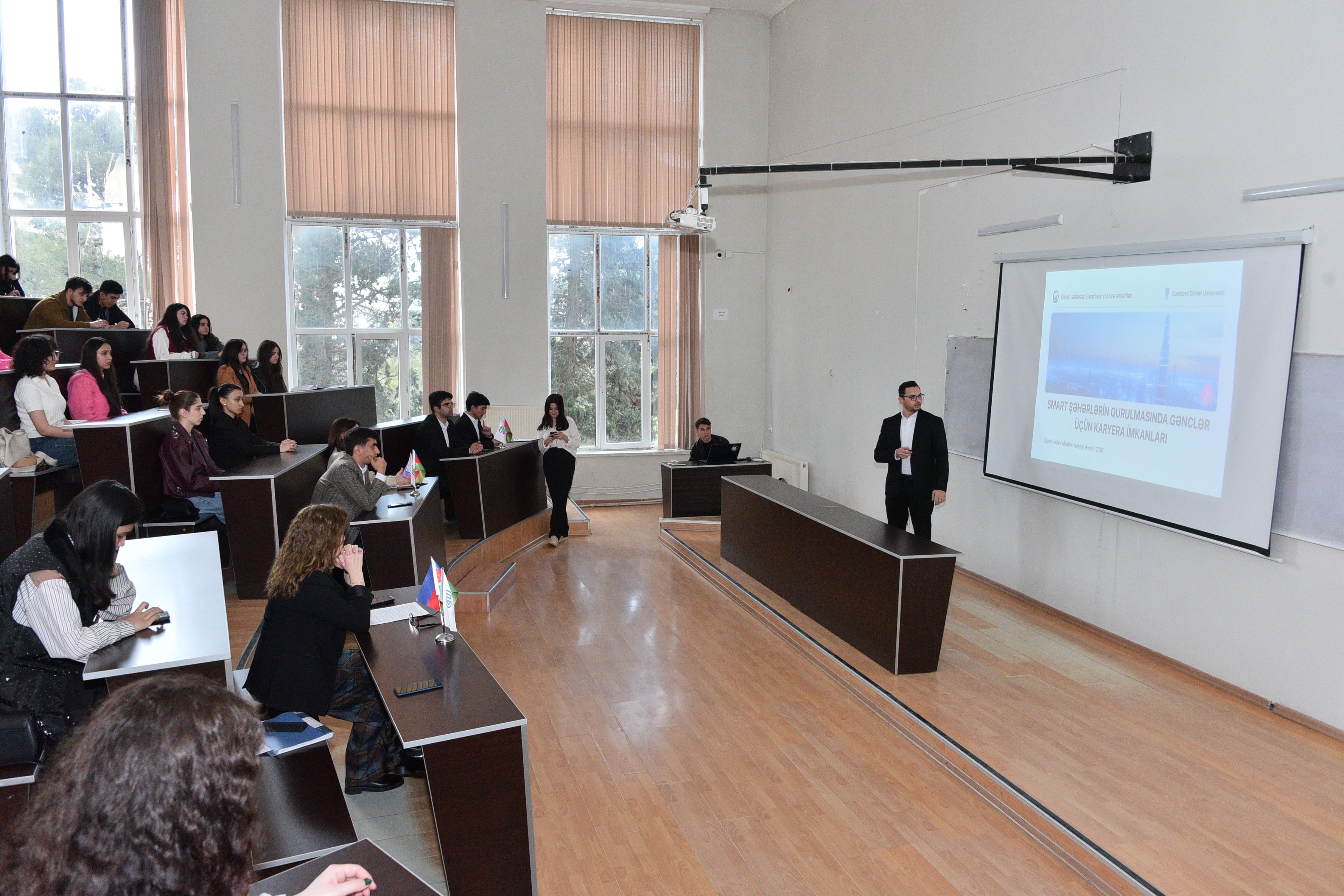 Aprelin 16-da Sumqayıt Dövlət Universitetində (SDU) Tələbə Gənclər Təşkilatının (TGT) təşkilatçılığı ilə WUF13 çərçivəsində “Smart şəhərlər: Gənclərin rolu və imkanları” mövzusunda tədbir təşkil olunub. Açılış nitqi ilə çıxış edən TGT-nın sədr müavini Oruc Quliyev mövzunun aktuallığından bəhs edərək bildirib ki, müasir dövrdə texnologiya həyatın bütün sahələrinə sürətlə nüfuz edir. “Smart şəhər” konsepsiyası bu inkişafın ən mühüm və aktual təzahürlərindən biri kimi çıxış edir. Bu baxımdan tədbir çərçivəsində səsləndiriləcək məruzələr böyük maraq doğuracaq. Sonra Mühəndislik fakültəsinin Kimya mühəndisliyi və Ekologiya kafedrasının baş müəllimi Azadə Əliyeva “Smart şəhərlər: ekoloji problemlərə davamlı həllər”, İqtisadiyyat və İdarəetmə fakültəsinin Biznesin idarə edilməsi kafedrasının baş müəllimi İsmayıl Əmirli isə “Smart şəhərlərin qurulmasında gənclər üçün karyera imkanları” mövzularında təqdimatlarla çıxış ediblər. Məruzəçilər müasir şəhərlərin rəqəmsallaşması prosesindən, ağıllı texnologiyaların müxtəlif sahələrdə tətbiqindən və bu yanaşmanın şəhər həyatının keyfiyyətinin yüksəldilməsində oynadığı mühüm roldan bəhs ediblər. Eyni zamanda smart həllərin ekoloji problemlərin aradan qaldırılmasına verdiyi töhfələr və bu sahədə gənclər üçün yaranan yeni karyera perspektivləri diqqətə çatdırılıb. Onlar həmçinin smart şəhərlərin mahiyyəti, əsas komponentləri, ağıllı nəqliyyat və mobillik, enerji və şəbəkə sistemləri, eləcə də bu komponentlərin qarşılıqlı əlaqəsi və gənclər üçün karyera imkanları barədə məlumat veriblər.