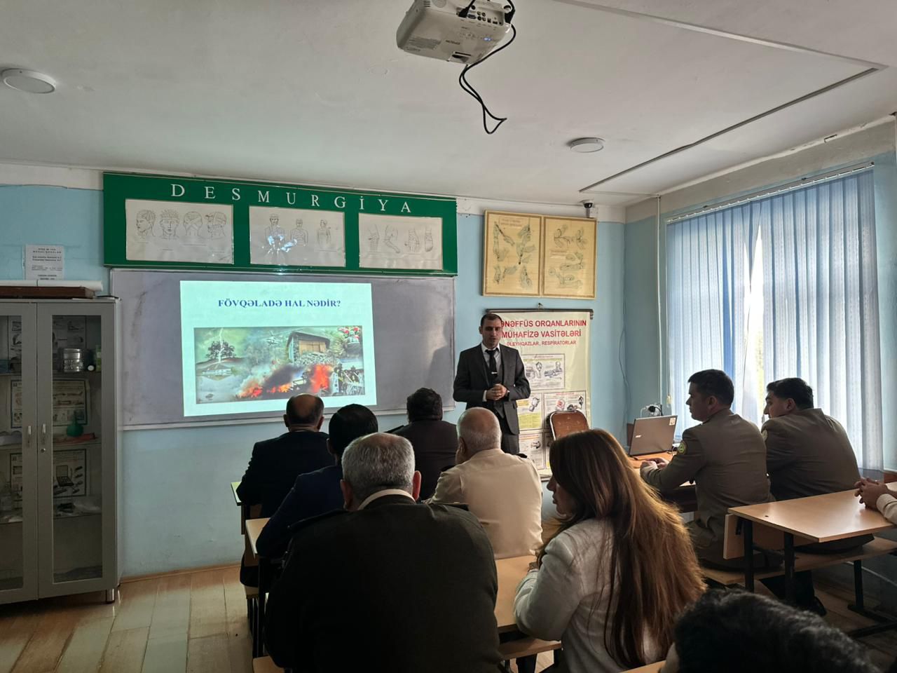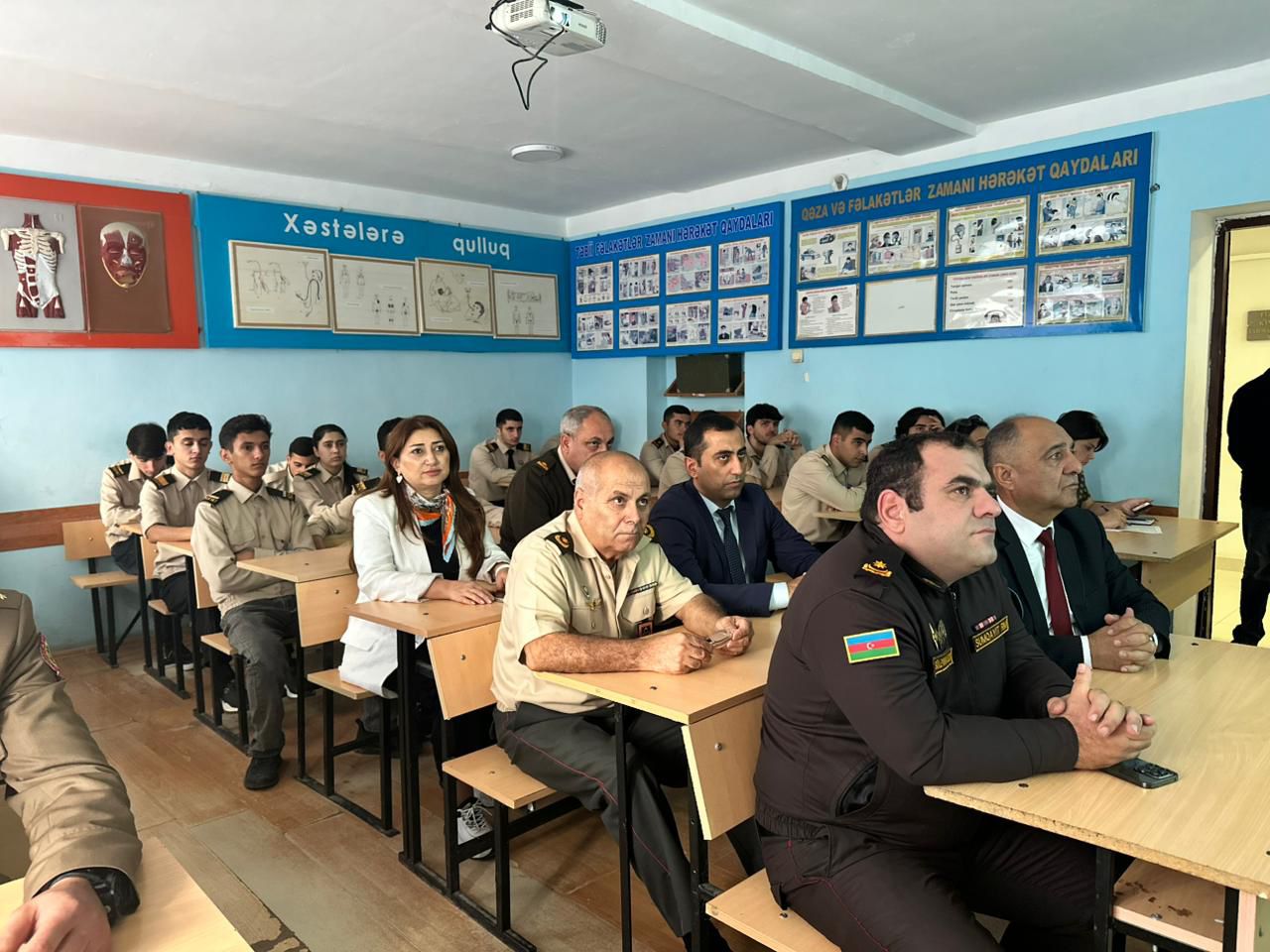 On October 16, in accordance with the annual action plan of the Civil Defense, Occupational Safety and Fire Protection Headquarters of Sumgayit State University (SSU), a model lesson on the topic "Organization of Population Protection in Emergency Situations" was held jointly with the Civil Defense Department of the Sumgayit Regional Center of the Ministry of Emergency Situations (MES). Head of the Civil Defense, Medical and Physical Preparedness Department at SSU, Tahir Khalilov made a speech and emphasized the need for educational work to prevent emergencies and prepare the population for these situations. Then, Head of the Civil Defense Preparedness Department of the Civil Defense Department, Major Suleyman Elchin spoke about the structure of the civil defense system, the measures taken to ensure the safety of the population, and the responsibilities of citizens. At the event, Senior Advisor to the Civil Defense Preparedness Department, Tamerlan Aliyev spoke on the topics of "Organization of Population Protection in Emergency Situations" and Officer of the Civil Defense Measures Planning Department, Captain Altay Huseynov spoke on the topics of "Ensuring Fire Safety, Rescue Techniques and Equipment."