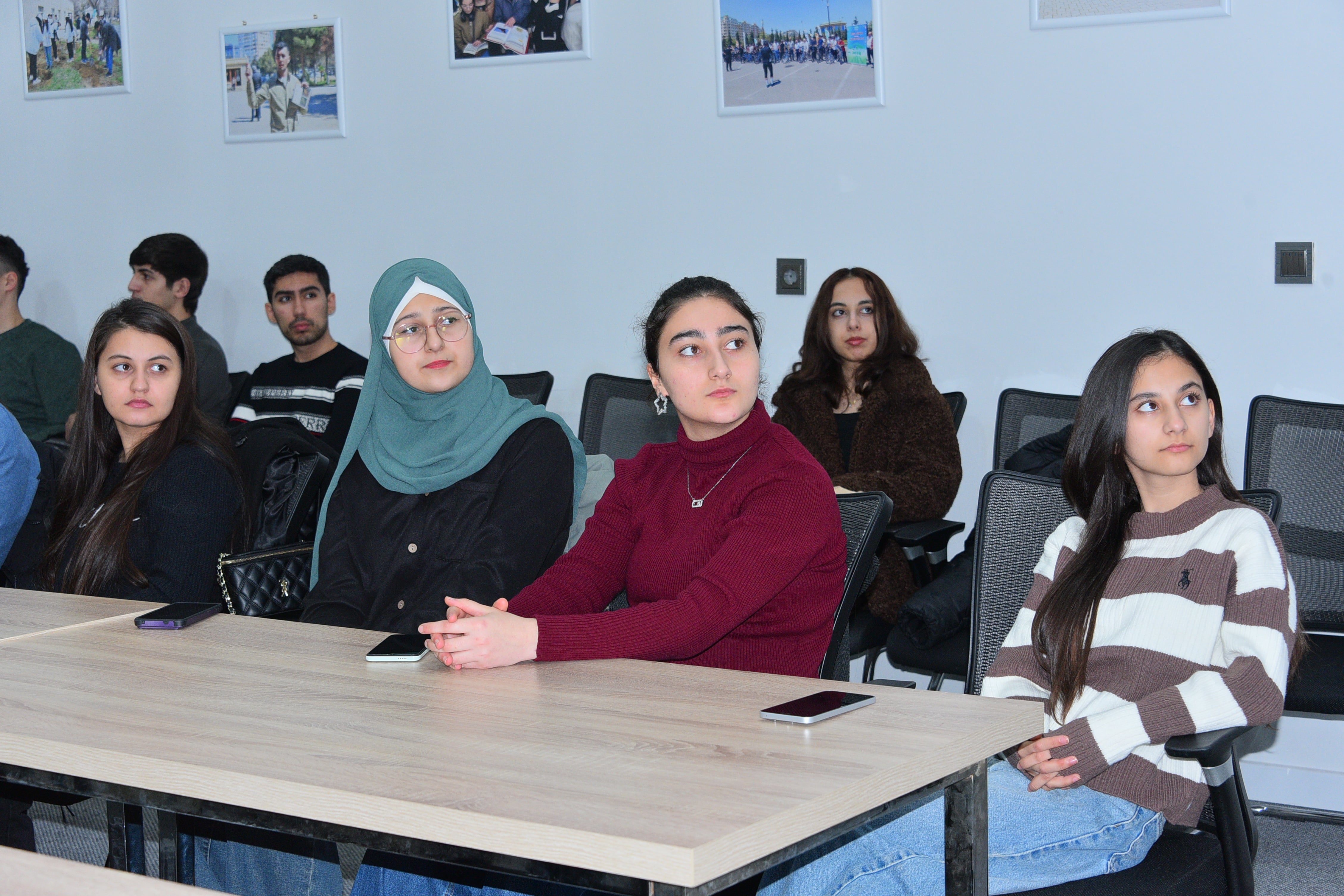 On December 16, a meeting was organized with the group representatives of the first-year students of the Faculties of Philology, Natural Sciences, at the initiative of the Quality Assurance and Strategy Department. Director of the Teaching and Methodological Center, Associate Professor Elnare Memmedova, the department’s employees and the group representatives attended the meeting. Director of the Teaching and Methodological Center, Associate Professor Elnare Memmedova provided students with the information about the teaching and learning process, assessment mechanisms and work carried out in this field. A specialist of the Quality Assurance and Strategy Department, Shams Shirinova made a speech and gave detailed information about the main aspects of the department’s activities, the surveys conducted to measure student satisfaction, and the importance of active participation in these surveys. She spoke about the mechanisms for organizing surveys, as well as practices such as interviews, suggestion boxes, and open door days, and encouraged the group representatives to be actively involved in these processes. In addition, information was provided by the department’s staff about the innovations implemented at the university based on the survey results. At the end of the meeting, the questions and suggestions of the participants were listened to, and discussions were held on various topics. It should be noted that on December 12, a meeting on the same topic was held by the Quality Assurance and Strategy Department with the group representatives of the faculties of Mathematics, History and Geography, Economics and Management.